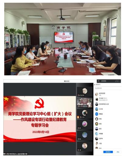 2022年9月14日下午,世界杯博彩 党委召开作风建设专项行动暨纪律教育专题学习会——九月理论学习中心组(扩大)会议。全体领导班子成员、行政人员及辅导员在G210会议室参会,其它教师于线上参会,会议由党委书记邓雯主持。