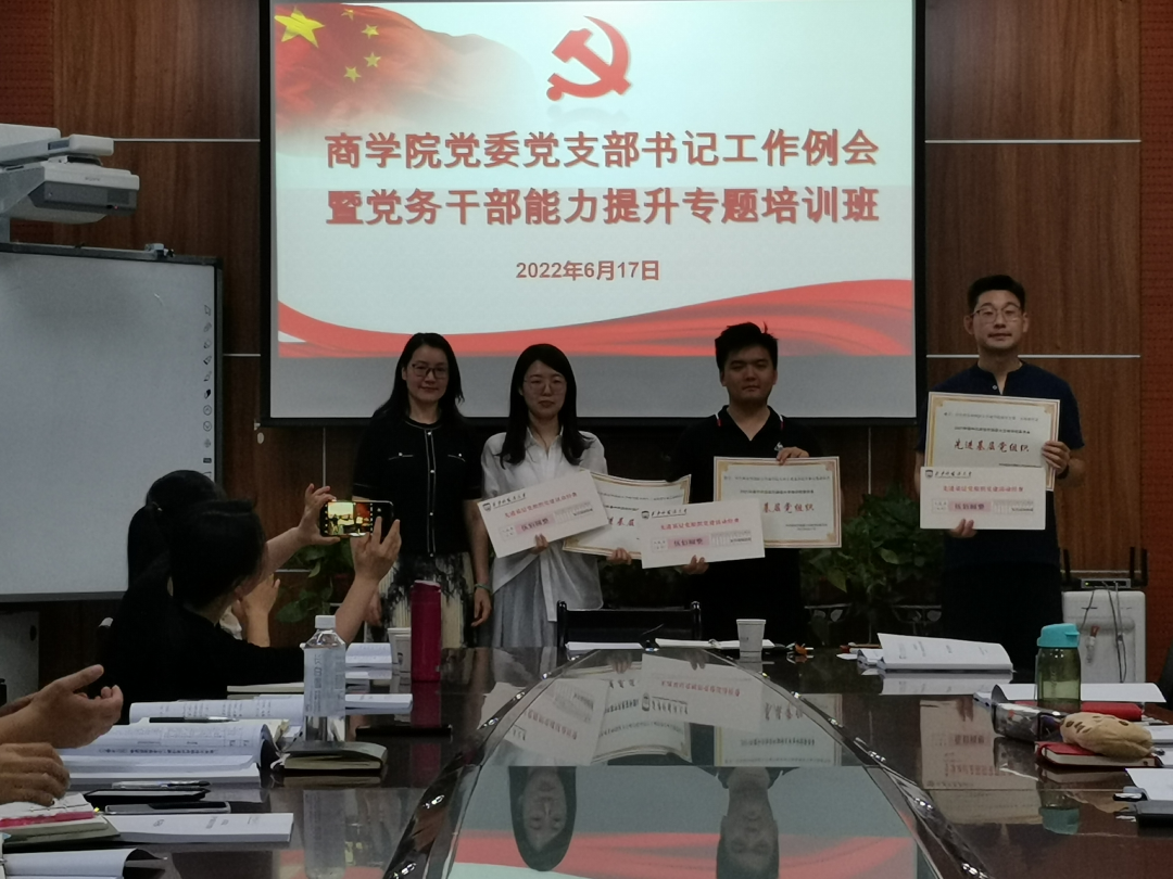 会上首先进行“2021年度商世界杯博彩 党委先进基层党组织”表彰仪式。由邓雯书记为研究生第一党支部、本科生商务英语党支部、本科生工商管理支部等3个先进党支部颁奖。