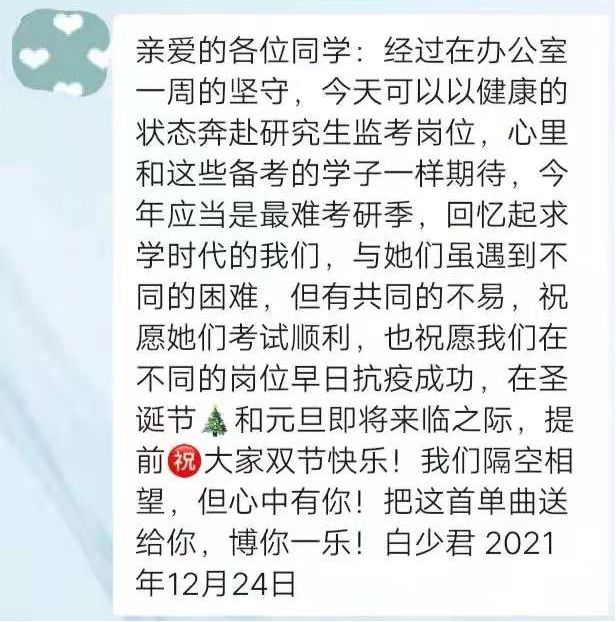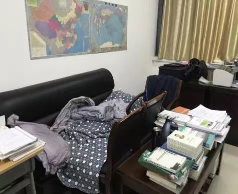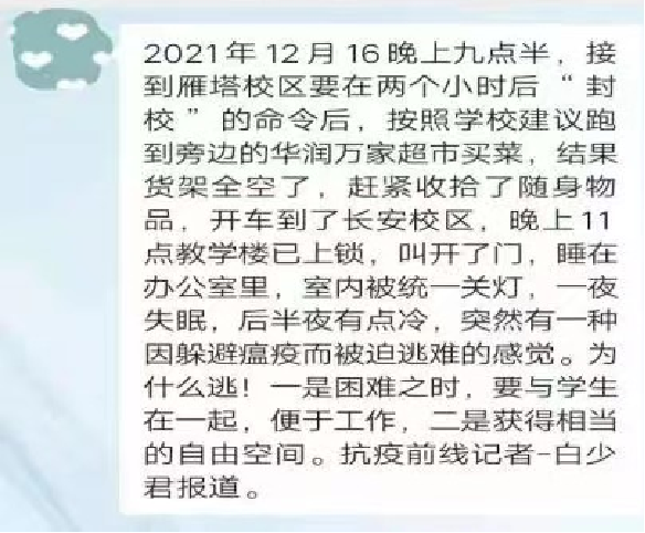在2021年12月西安疫情防控形势最为严峻的时候,学校实行封闭式管理,白老师主动请战,连夜从老校区赶赴新校区,开始了长达37天的办公室“住校”生活,守护着世界杯博彩 2000余名学生的生命安全和身体健康。