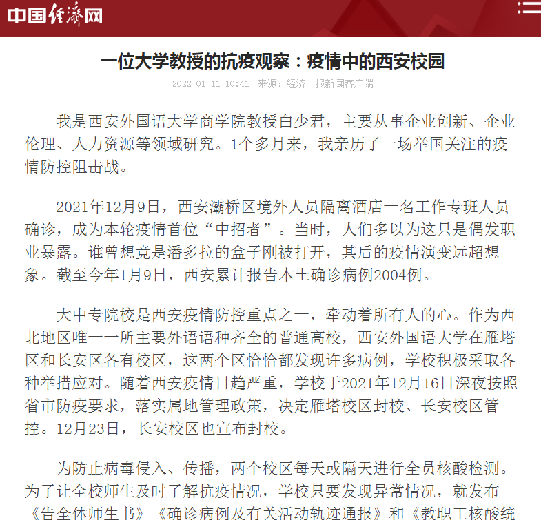白老师在《中国经济网》发表“一位大学教授的抗疫观察:疫情中的西安校园”