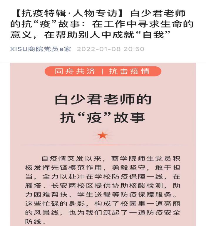 本期,我们一起走进2022年校级“疫情防控先进个人”获得者——白少君教授的先进事迹。