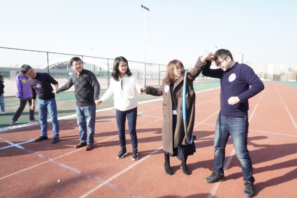 本次趣味运动会为团体比赛,组队形式新颖,游戏生动有趣。活动打破了传统以各系、各科室组队的壁垒,实现相互协作交流,提高团建效果。入场教职工现场随机抽号,经过大家“缘分”组队,一共形成红、橙、黄、绿、蓝、紫六支队伍。活动由“两人三足”绑腿迎面接力、“上天入地”呼啦圈趣味赛、“你投我接”羽毛球抢分战和搭桥过河四个项目组成。在比赛过程中,场上的老师合作无间、勇夺高分,场下的老师喝彩欢呼、加油助威,大家脸上始终洋溢着轻松快乐的笑容,活动气氛十分活跃。