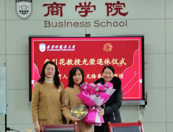 院长耿紫珍为乔引花教授颁发光荣退休纪念盘,党委书记邓雯为乔引花教授献花。