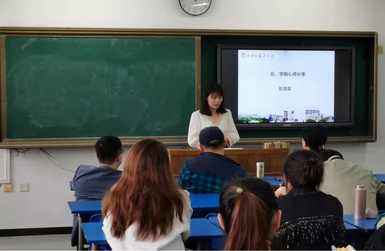 接下来是王艳粉学姐和邓茂露学姐就研究生的学习生活为我们分享了他们自身的心得体会,重点分享了研究生的学习规划以及学习方法,为同学们今后的研究生生活提供了建设性的意见。