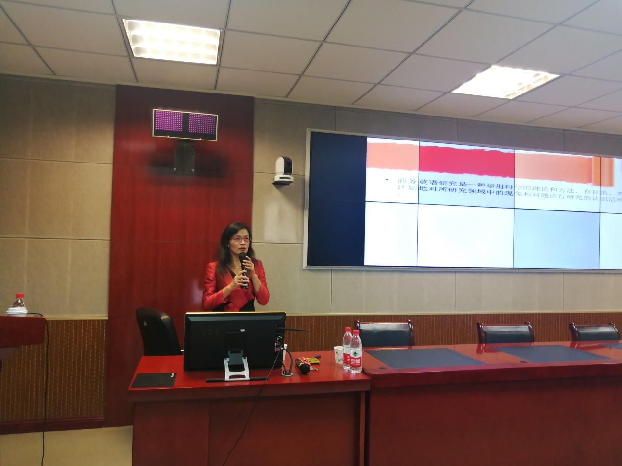 讲座中,徐珺教授简要回顾了商务英语专业自2007年招生以来的研究成果,并具体解释了商务英语的专业内涵。其次,她就商务英语如何定位、专业知识及能力的构成、商务英语的研究现状、商务英语教学理念转型、商务英语研究创新、商务英语研究原则以及“一带一路”倡议实施背景下商务英语跨学科发展的机遇和挑战等做了系统说明。她指出,目前的商务英语研究专著或论文趋于平缓,但质量相对提高,仍有很大提升空间。在商务英语跨学科研究中,必须坚持创新性、学术性、前瞻性、本土化和规范化的原则,强调创新是永恒不变的主题。随后,徐珺老师就商务英语研究的具体方法、具体研究领域和论文写作做了详细讲解。