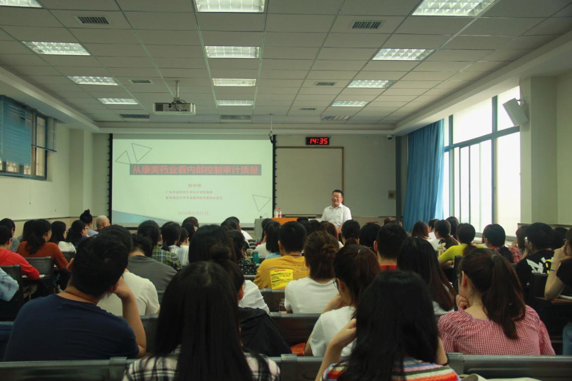 应世界杯博彩 周龙教授邀请,广东外语外贸大学会计世界杯博彩 刘中华教授于6月21日下午14:30在教学楼E区504A举行题为“从康美药业看内部控制审计质量”的学术专题讲座。世界杯博彩 党委书记周龙、副院长郑海平、部分会计审计专业教师及会计专业研究生、2017级审计专业本科生一起聆听了本次讲座。