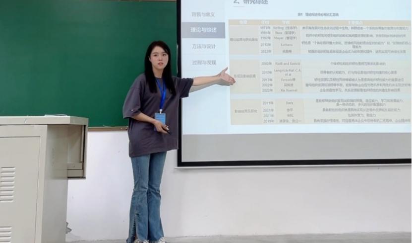 企业管理专业硕士赵佳丽就《身居高位者为何知而不言?基于模糊集定型比较分析的方法》进行汇报。她基于上下级知识流动过程中出现的上级知识隐藏行为进行研究,运用模糊集定性比较分析的方法从团队内部上下三个层面进行分析,得出领导者高(非高)知识隐藏行为的组态路径,补充了研究领域中垂直层面知识管理的内容。其研究对管理者促进组织内部知识共享,增强知识管理以及为增强知识运用能力提供了理论支持。