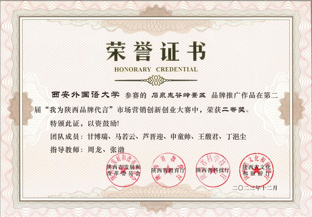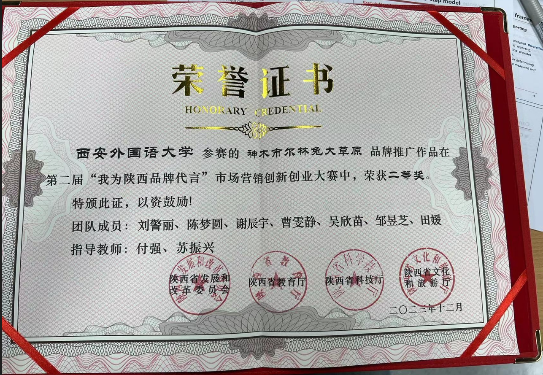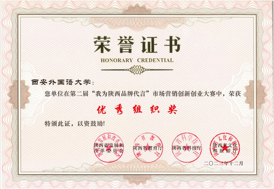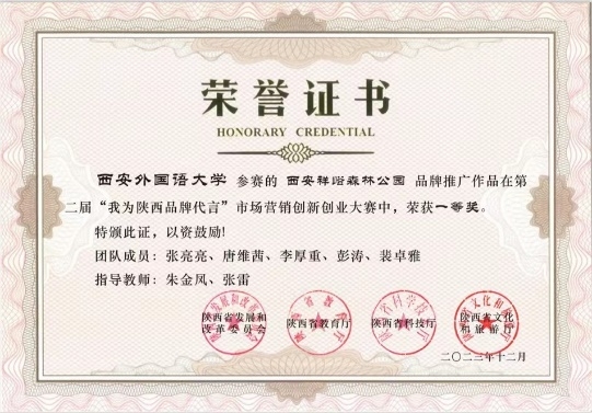近日,由陕西省发展和改革委员会、品牌和高质量发展研究中心主办的陕西省第二届“我为陕西品牌代言”市场营销创新创业大赛总决赛在西安理工大学隆重举行。来自全省40余所高校的400余支队伍参加了激烈角逐。2026世界杯投注网站 13支代表队表现出色,共获得一等奖1项、二等奖2项、三等奖3项、优胜奖3项,展现了2026世界杯投注网站 学子的创新思维和实践能力。其中,“西安祥峪森林公园”品牌推广参赛队(张亮亮组)获得唯一的一等奖,石泉鬼谷岭景区(甘博瑞组)、神木市尔林兔大草原(刘警丽组)获得二等奖,同时,西安外国语大学荣获大赛优秀组织奖。