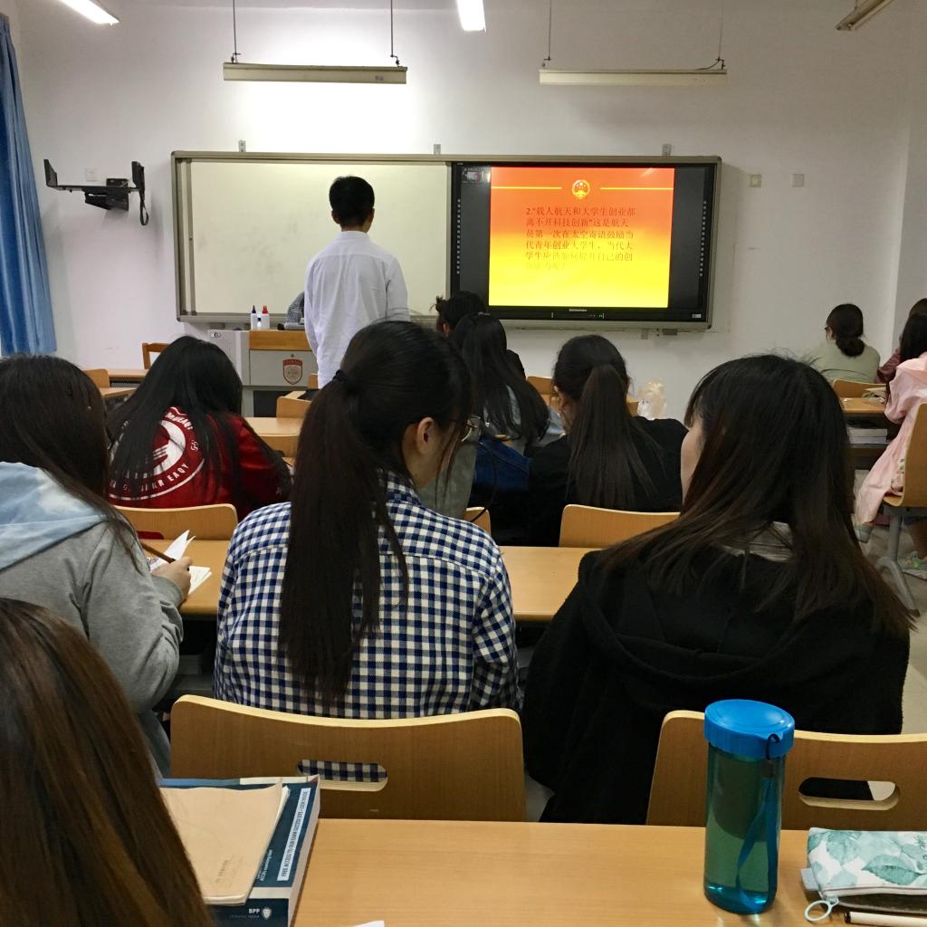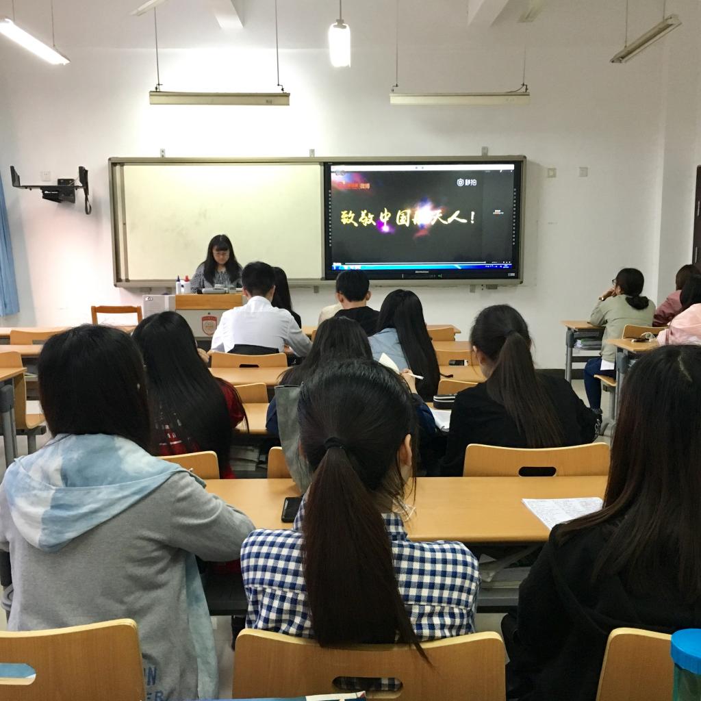 首先,大家共同观看了短片《揭秘神舟一号》。主持人简要介绍了中国航天的发展历程,并就中国航天背后的故事,航天人艰苦奋斗、无私奉献的“航天精神”进行了重点讲解。紧接着,同学们结合航天精神,对目前应试教育标准化思维现状下,如何培养创新意识、拓展创新思路、提升创新能力等方面展开了热烈地探讨。