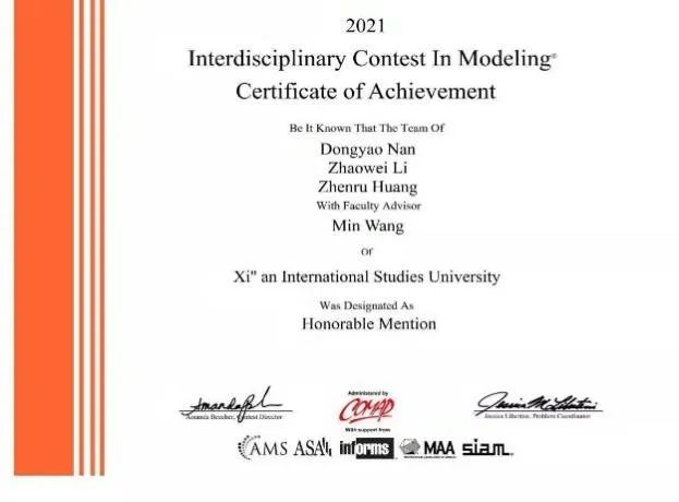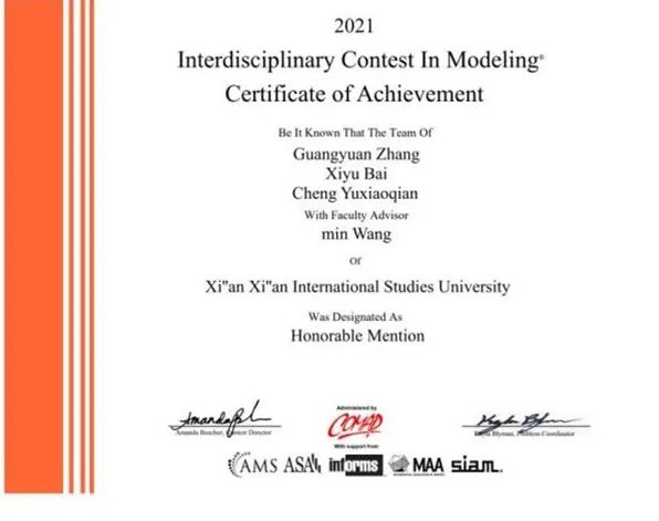 美国(国际)大学生数学建模竞赛是世界顶级的数学建模竞赛,享有数学建模“奥林匹克”之称。该项赛事是世界上影响范围最大的大学生学科竞赛之一,赛题内容涉及经济、管理、环境、资源、生态、医学、安全、未来科技等众多领域,旨在锻炼学生运用数学思维分析与解决现实生活问题的能力,提升学生的团队协作精神,要求学生不仅要具备深厚的数学基本功,而且还要有很强的英语科技、商务论文写作能力。(图文来源:王敏 排版:新媒体发展中心网络部 易柱 审核:张雷 王鹏)