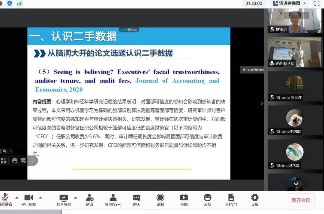 付强博士从认识二手数据、财会数据的处理方法和财会领域研究方法的体会三个方面出发,介绍了二手数据的有关研究方法。在认识二手数据中,付老师介绍了二手数据的定义、分类以及特点。在财会数据的处理方法方面,付老师重点讲述了实证研究方法的框架与步骤,各种方法的适用性等。在财会领域研究方法的体会中,付老师从自身经历出发,分享了自己在会计实证研究过程中的心得体会。