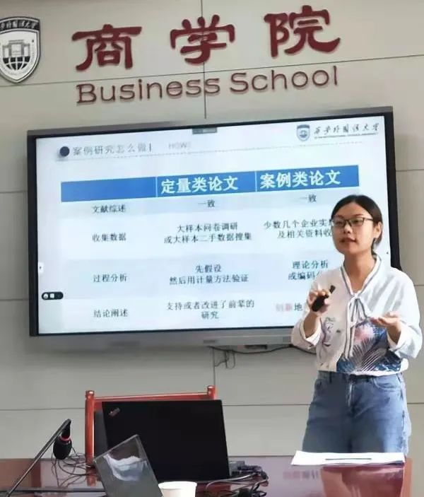 最后,崔杰副教授分别从为什么做案例调查、案例研究是什么、案例研究怎么做三个方面展开案例研究方法讲座。在为什么做案例调查环节中,她认为要研究中国问题,创造中国特色的理论,将论文发表在中国的期刊上,以解决中国的实践问题;在案例研究是什么中,通过对比定量研究和案例研究,让同学们加深了对案例研究的理解和认识;在案例研究怎么做环节中,崔杰副教授介绍了案例研究的步骤,并从华为案例出发,展示了具体研究过程。