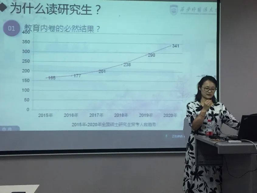 贾老师谈到学生考取研究生,是为了遇见更好的自己。对于如何读研究生,她鼓励大家应该做到博览、乐研和自我价值提升。