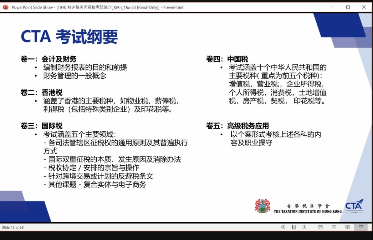 会上,刘昭华对香港税务学会进行了简要介绍,香港税务学会成立于1972年,现今已有50年的历史,学会由税务专业人士构成,旨在促进交流税务知识和税务研究,同时举办针对青年的税务类比赛,向政府和企业提供税务咨询等。她重点介绍了特许税务会计师(CTA)考试的相关内容,从考试模式介绍、考试纲要、应试资格、考试安排和考试支援等方面进行了详细说明。