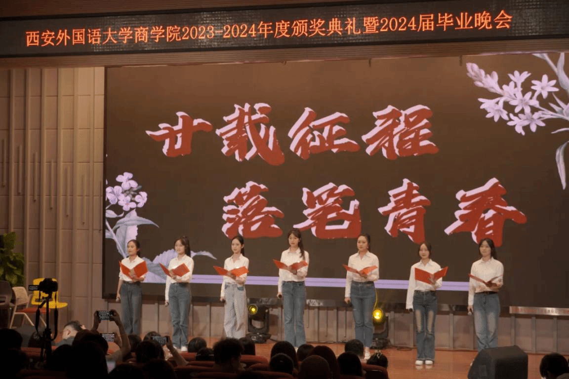 韶光如水,岁月匆匆。朗诵《廿载征程,落笔青春》,抒发了新时代商院青年赓续红色血脉的决心与力量,矢志建功立业的豪迈与激情,同时表达商院学子怀着赤子之心,对母校和恩师的深沉眷恋与感恩。舞蹈《万疆》融合现代舞和古典舞元素,配合舞蹈长裙悠扬大气,彰显华夏之壮美,山河之辽阔。表达新时代青年生逢盛世、当不负盛世的坚定信念。清风乍起,繁花盛开,背负行囊,昂首出发。晚会尾声,毕业生代表合唱歌曲串烧《鲜花》,祝福所有2024届毕业生前程似锦,一路生花!