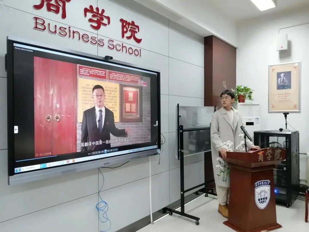 课程第一项,由主持人带领全体同学观看了学习视频,视频讲述了中国共产党成立诞生、成立,重温《共产党宣言》的修订及翻译过程。在主持人的带领下,参会成员展开了热烈的探讨交流。
