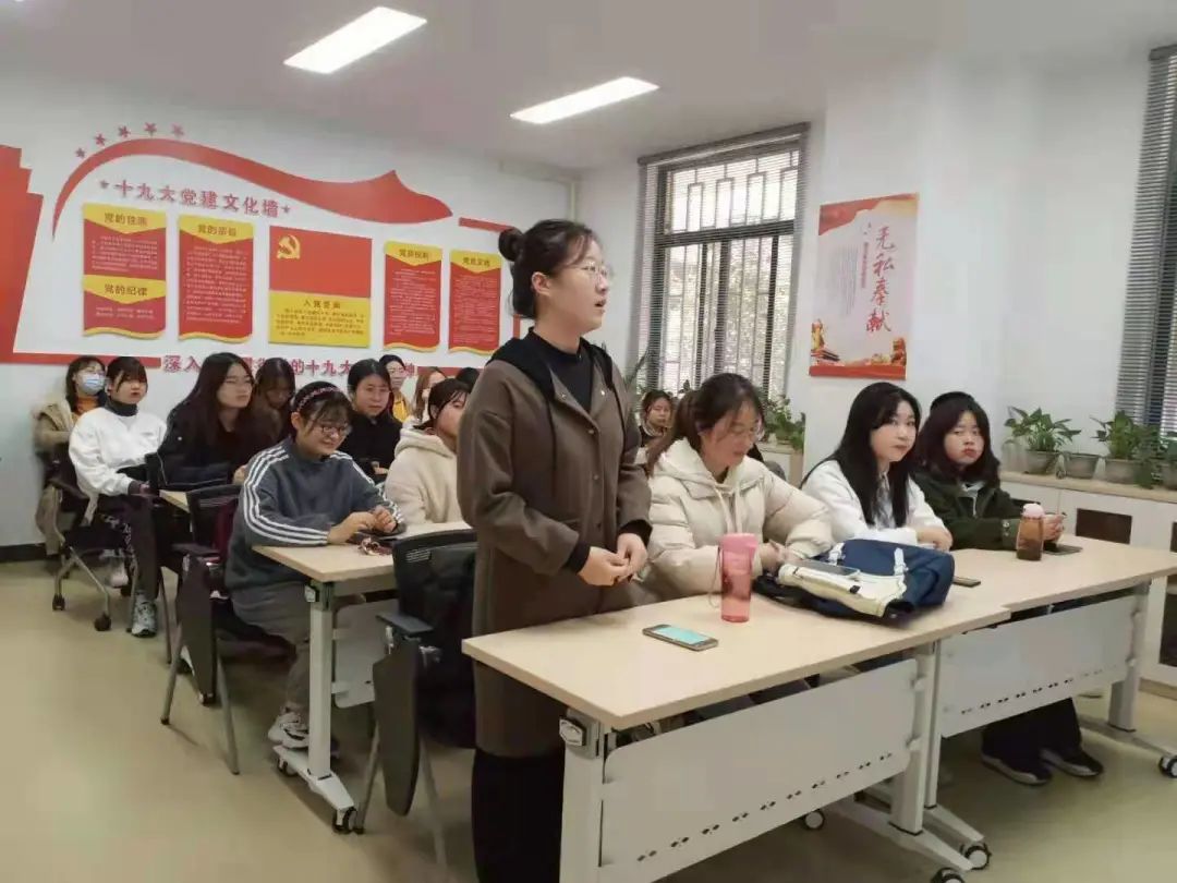 随后,学生代表分别围绕学习和生活进行分享与讨论。班长张博文疫情期间积极参与家乡疫情防控工作,以实际行动践行新时代青年大学生的爱国初心;任月婷和李丹丹同学分别结合爱国诗歌《离骚》和《满江红》,分享对爱国主义内涵的理解,同时表示爱国、爱校要从身边小事做起,将爱国之心、报国之志落到实处。