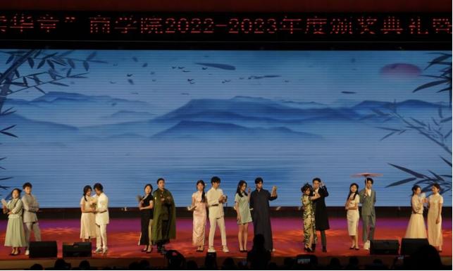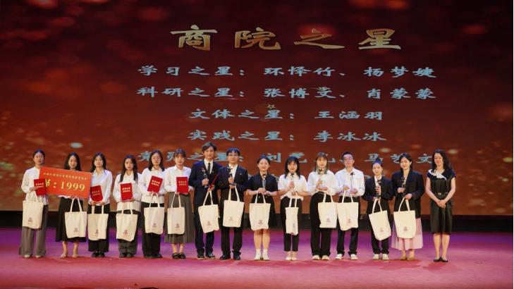 晚会过程中,进行了2022-2023年度颁奖典礼,通过挖掘榜样、选树典型,为一代一代的商院学子指明前行方向。本次颁奖分为两个阶段,首先对2023届在校期间积极向上,努力学习,表现优异的毕业生颁发“商院之星”荣誉称号,并对在ACCA、CIMA全球统考以及相关比赛中成绩优异的学生予以表彰。