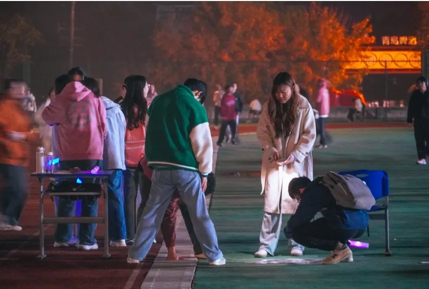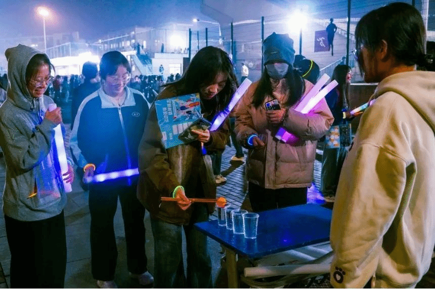随着起跑哨声响起,整个校园瞬间被荧光所点亮。学生们手持荧光棒,在夜色中奔跑向前,为校园增添了一道亮丽的风景线。荧光夜跑活动在欢快的氛围中正式拉开帷幕。