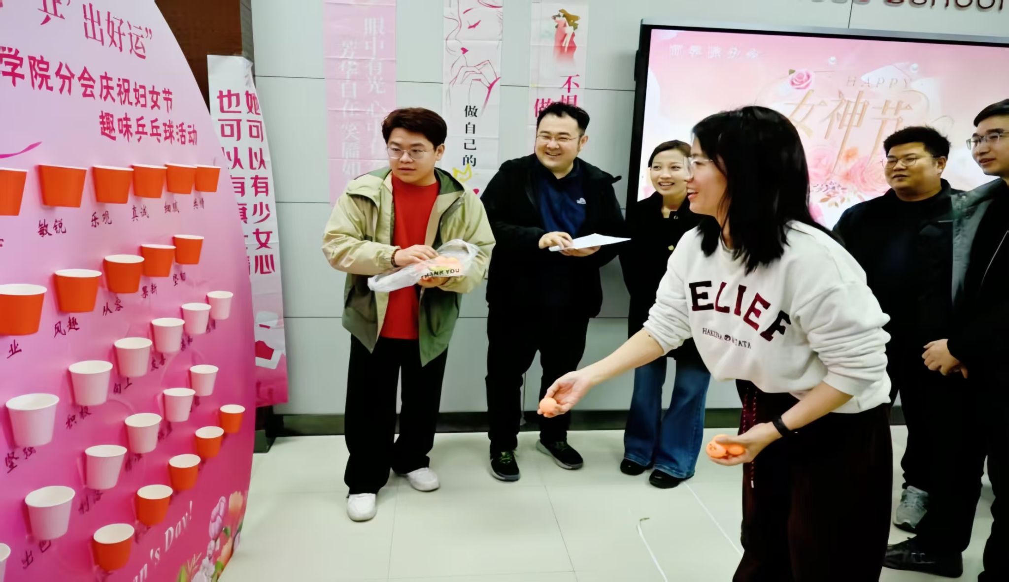 活动现场布置温馨雅致,粉色背景板上“温柔、善良、聪慧、独立”等美好词汇与纸杯相映成趣,处处洋溢着节日的暖意。趣味投球游戏规则简单却充满乐趣:老师们手持乒乓球,瞄准贴有不同美好品格标签的纸杯,将球投入杯中即可获得对应惊喜。大家纷纷踊跃参与,弯腰瞄准、抬手投掷的动作一气呵成,清脆的落杯声与欢快的喝彩声此起彼伏,现场笑声不断、暖意融融。