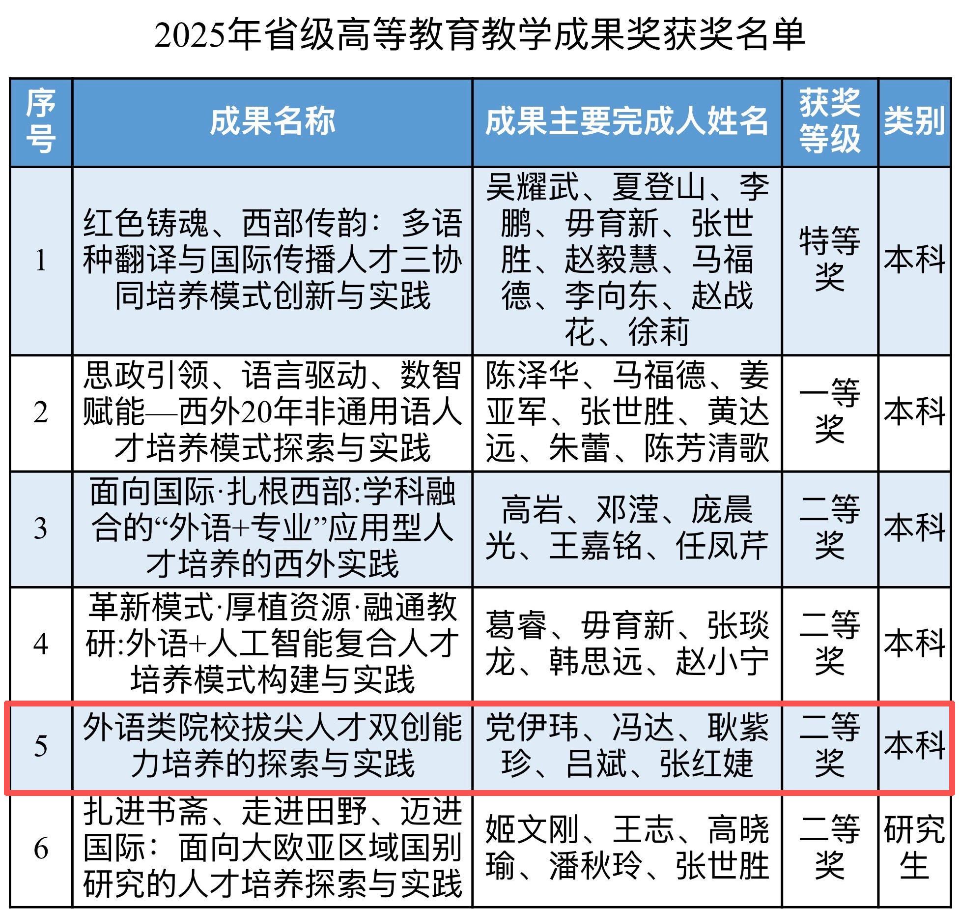 近日,陕西省人民政府公布2025年高等教育教学成果奖评选结果,西安外国语大学共获6项省级教学成果奖,实现本科与研究生教育领域双丰收。世界杯博彩 副教授党伊玮团队完成的《外语类院校拔尖人才双创能力培养的探索与实践》荣获本科教育类二等奖。