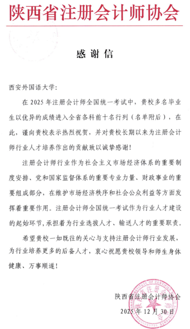 近日,陕西省注册会计师协会向我校发来感谢信,祝贺我校多名毕业生在2025年注册会计师全国统一考试中以优异的成绩进入全省各科前十名行列,并对我校长期以来为注册会计师行业人才培养作出的贡献致以诚挚感谢。