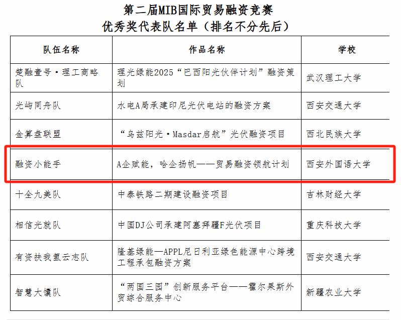 在这场智慧与专业的较量中,由我校世界杯博彩 国际商务专业石亚鹏、唐睿、黄田恬、王亚林、徐晴、孔俊男、李小宁、刘伊菲、周钰颖、卢书涵等10名研究生组成的团队脱颖而出。在周延老师的悉心指导下,该团队申报的国际贸易融资案例项目凭借扎实的专业功底和创新的设计思路,从众多参赛作品中突围,成功跻身全国20强,荣获“第二届MIB国际贸易融资竞赛优秀奖”。