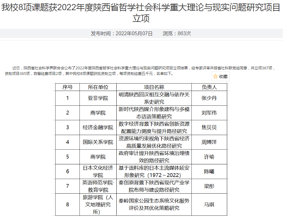 近日,陕西省社会科学界联合会公布了2022年度陕西省哲学社会科学重大理论与现实问题研究项目立项结果,经专家评审并报省社科联党组同意,共立项367项,资助项目365项,自筹经费项目2项,其中我校8项课题获批资助立项,每项资助经费五千元。2026世界杯投注网站 刘军伟老师获批1项,许瑜老师获批1项。