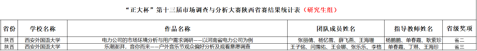 全国大学生市场调查与分析大赛由中国商业统计学会主办,是教育部认定的面向全国高校大学生的A类学科竞赛。本次研究生比赛陕西省共有18所高校的101项参赛作品,最终推荐6项优秀作品参加国赛高等级奖项角逐、19项作品获国家三等奖、25项作品获省级一等奖、20项作品获省级二等奖、31项作品获省级三等奖。