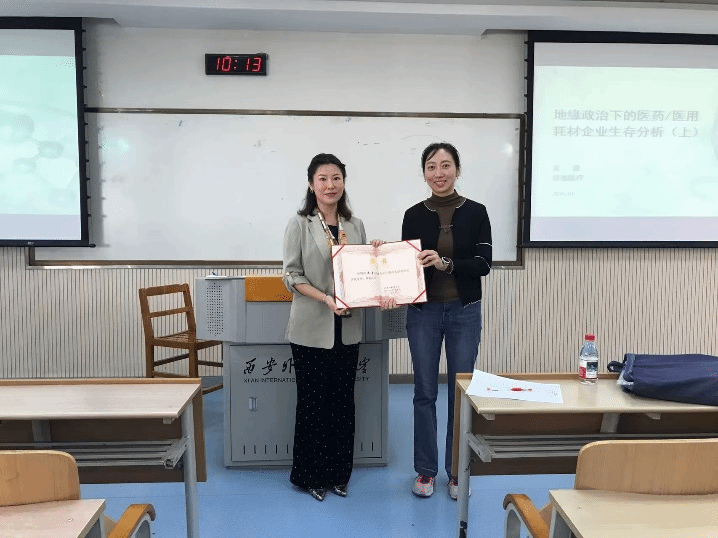 在讲解贸易战与疫情对行业的影响时,吴蕾总监重点分析了供应链区域化重构、技术封锁应对、关税成本对冲等实战策略,通过迈瑞医疗本土化产能布局、微创医疗技术突破等案例,具象化呈现企业在复杂环境下的生存智慧。分享过程中,她还结合医药行业招标管理、渠道建设、人才培养等实务内容,为学生提供了兼具理论深度与实践价值的行业认知。