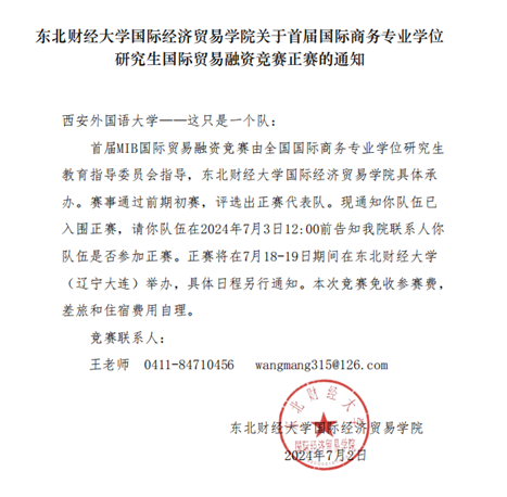 2024年7月1日,由全国国际商务专业学位研究生教育指导委员会指导,东北财经大学主办的全国首届国际商务专业学位研究生(MIB)国际贸易融资竞赛复赛落下帷幕。本次比赛于2024年3月20正式启动,收到来自全国48所高校的40支参赛队的参赛材料,最终决出16支队伍入围后续决赛环节。