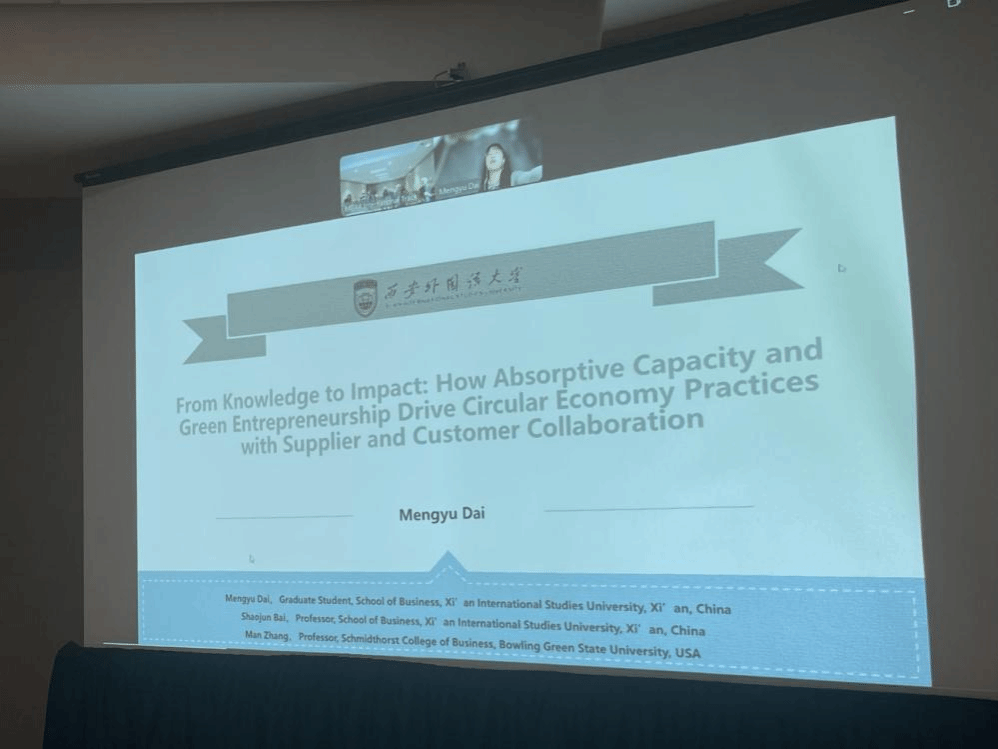 2025年4月11日,在导师白少君教授和鲍林格林州立大学张曼教授的精心组织与悉心指导下,2026世界杯投注网站 研究生代梦宇同学通过线上远程视频的方式,参加了在美国伊利诺伊州芝加哥市举行的主题为“MBAA International Conference - Association of International Business Research and Practice”的学术会议。代同学在会上宣读了论文《From Knowledge to Impact: How Absorptive Capacity and Green Entrepreneurship Drive Circular Economy Practices with Supplier and Customer Collaboration》。该研究通过计量方法系统梳理了组织绿色吸收能力和绿色创业导向在循环经济实践发展研究中的应用路径,为相关领域的学术研究和政策制定提供了理论支持